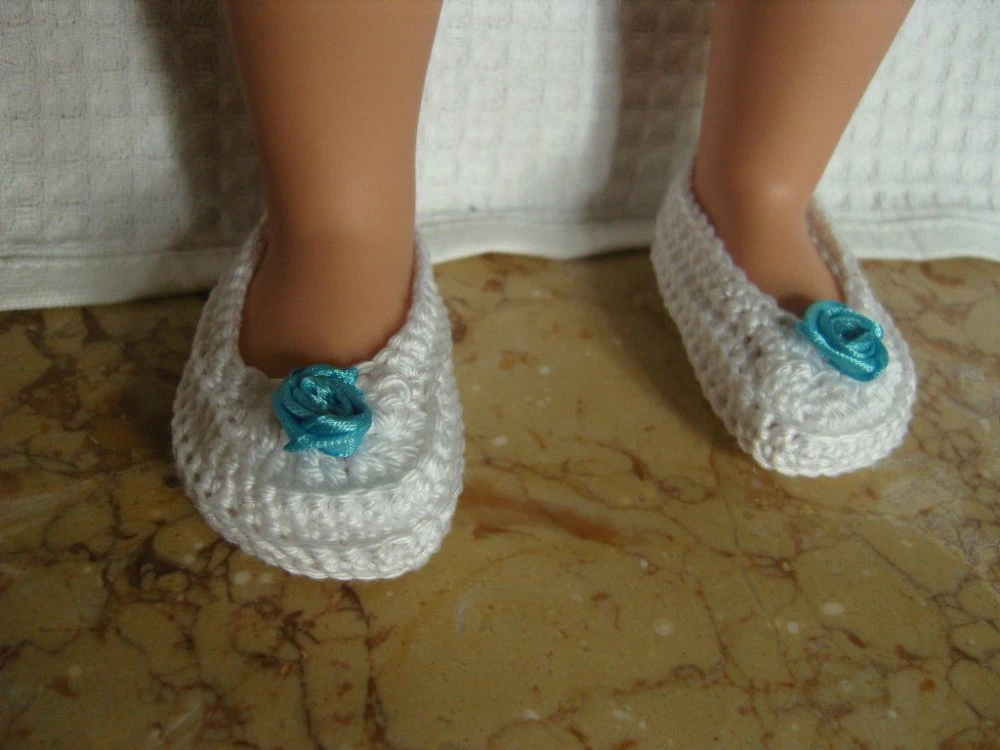 et une paire de ballerines réalisée au crochet en coton blanc, fleur en satin décorative.