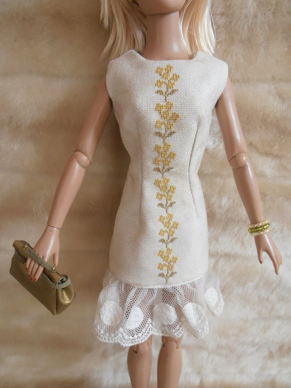 – une robe brodée main au point de croix, doublée et fermée dans le dos par des boutons pression, volantée en dentelle dans le bas