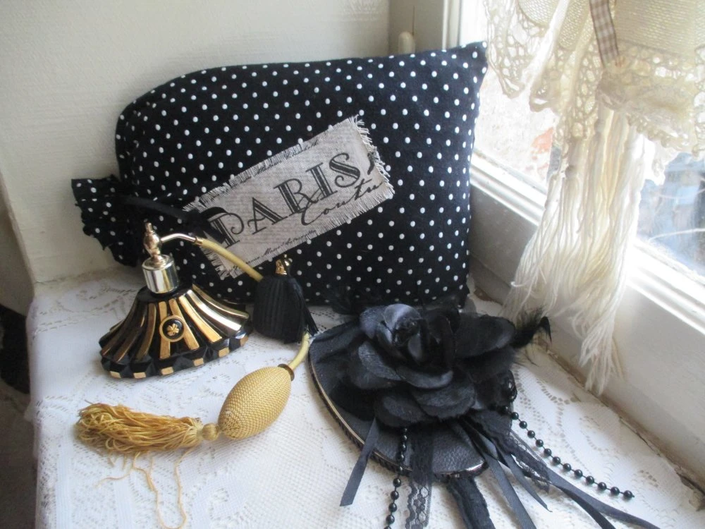 Décors : Noir et or, poire pompon, bouton noir et or C. Chanel.