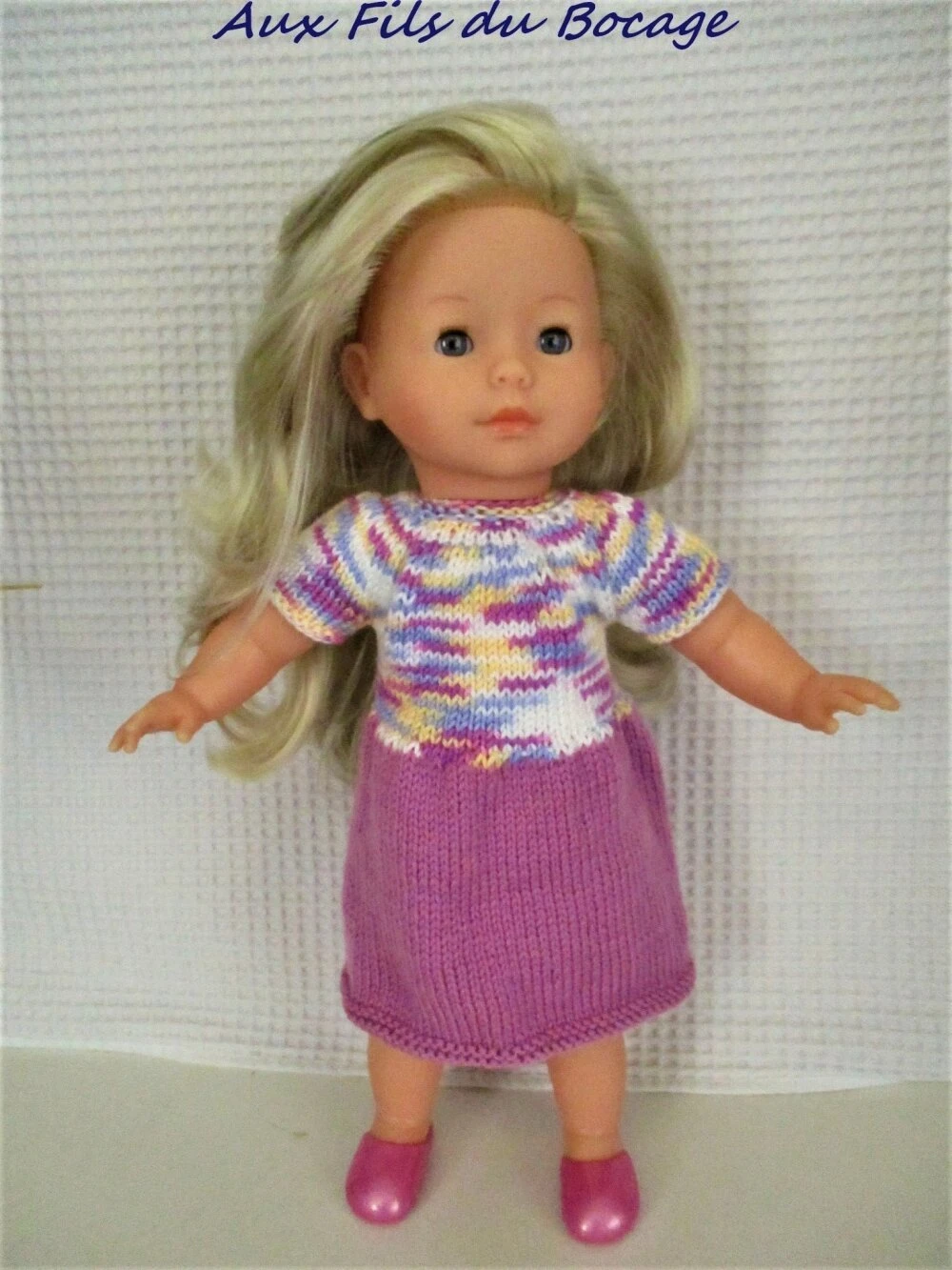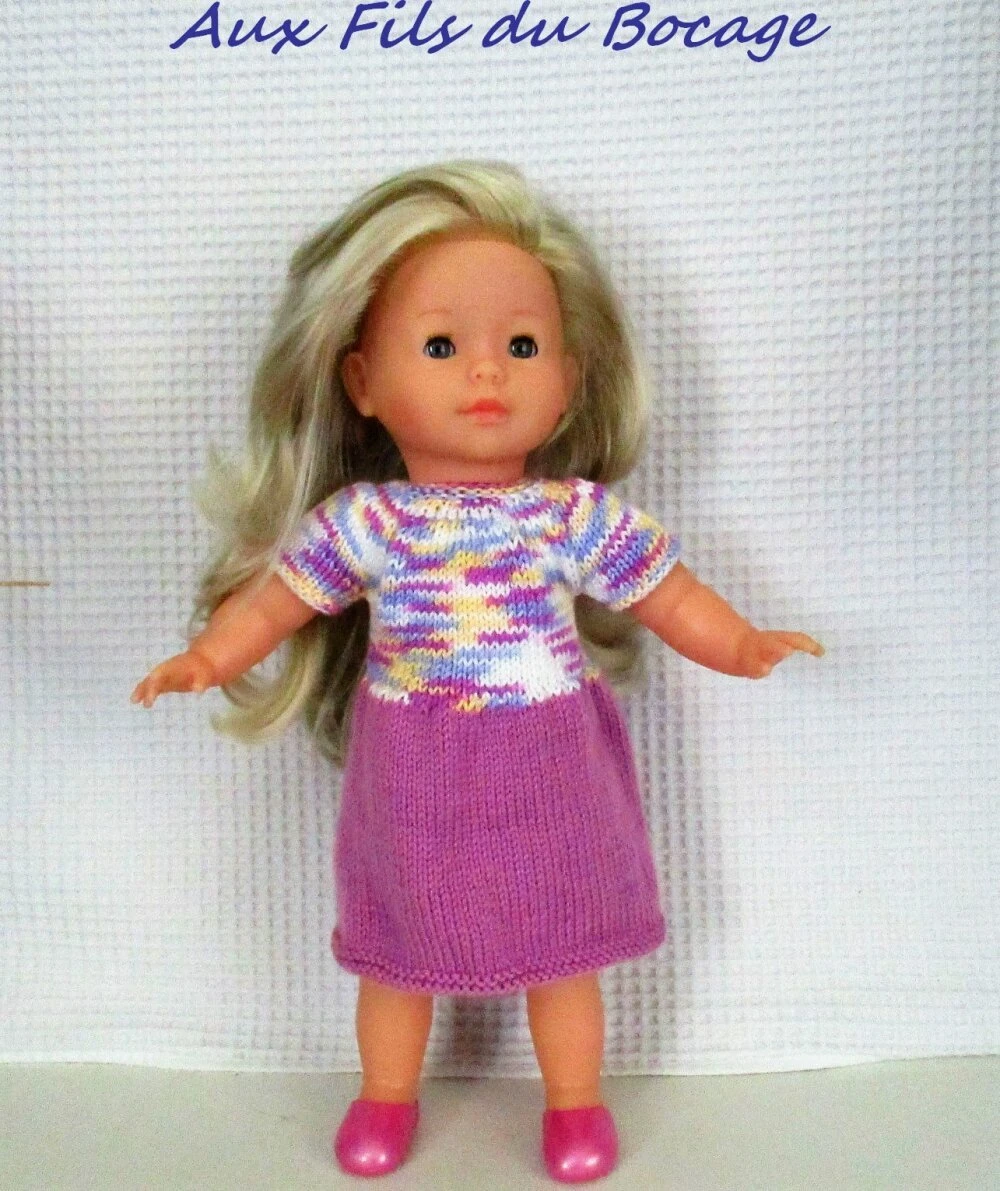 Cette robe est réalisée au tricot avec une laine multicolore et une laine rose.