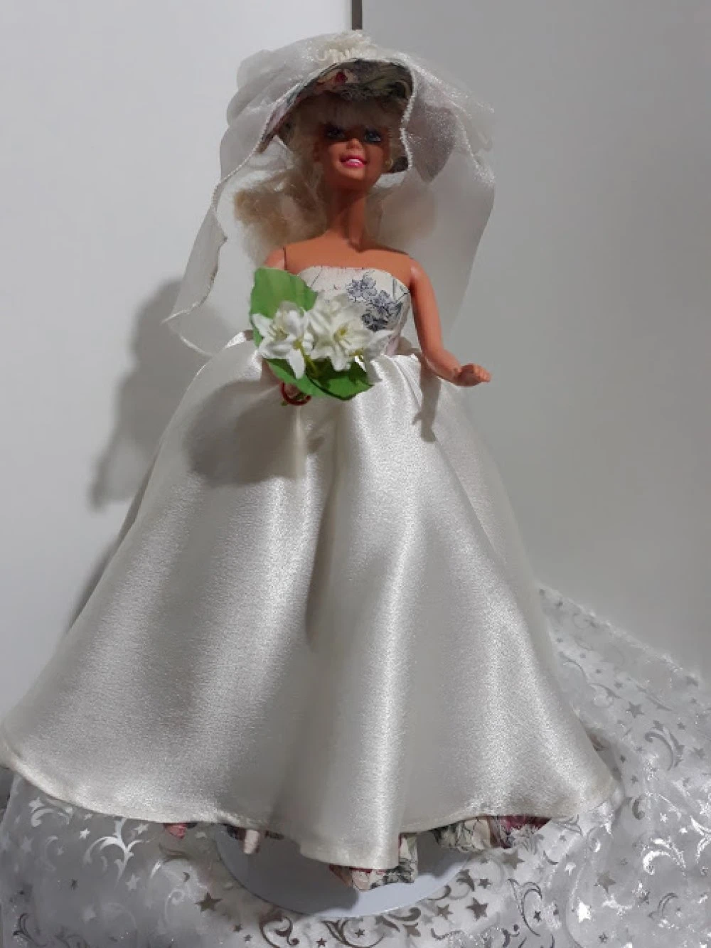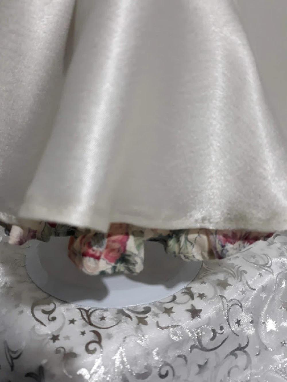 robe en tissu précieux satin écru, bustier et volant jupon en tissu coton patch fleuri