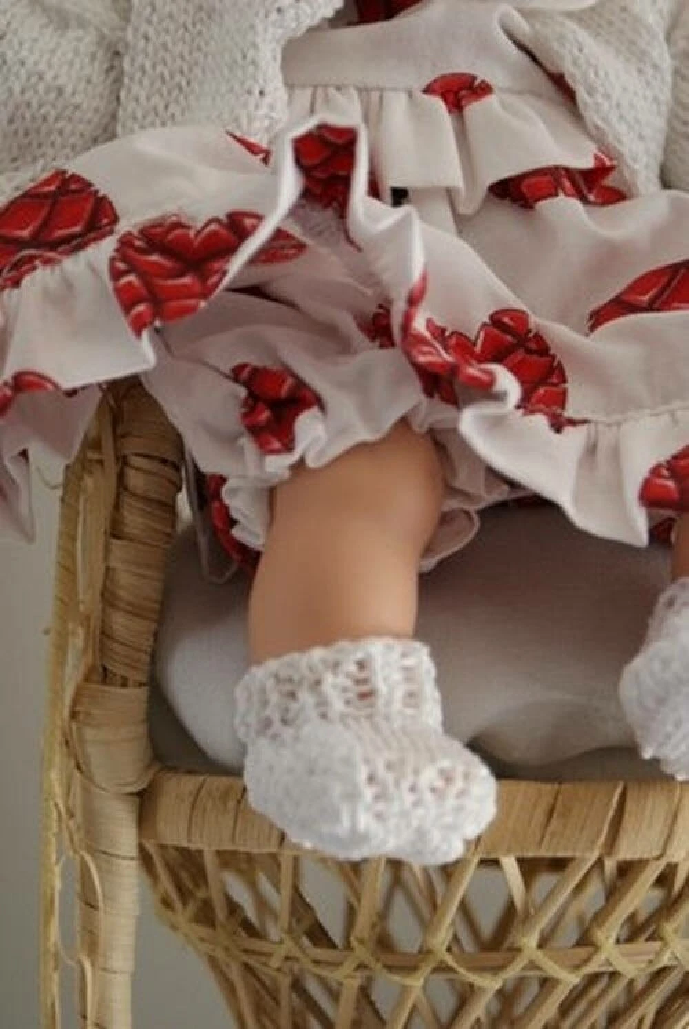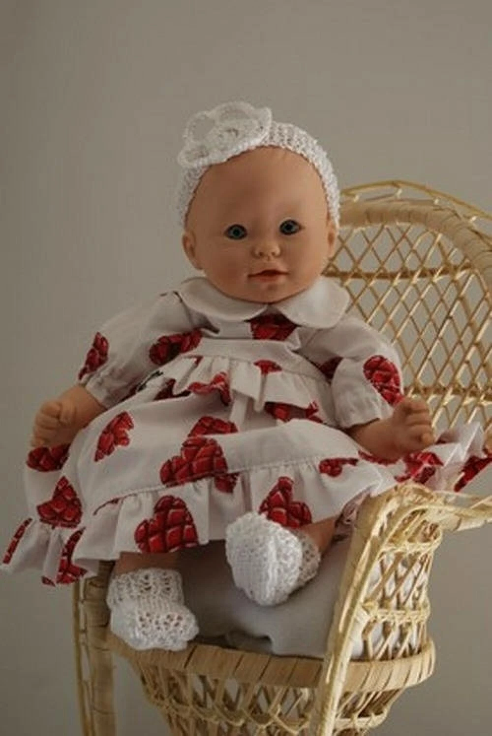 tenue pour poupon de 30 cm , composée de 5 pièces : une petite robe fond blanc imprimée de petits cœurs rouges style tablettes de chocolat , avec volant sur le bas de robe ,col blanc et fermeture par boutons pressions dans le dos. Accompagnée d’un petit pull en coton blanc , un bandeau et une paire de chaussons coordonnés.