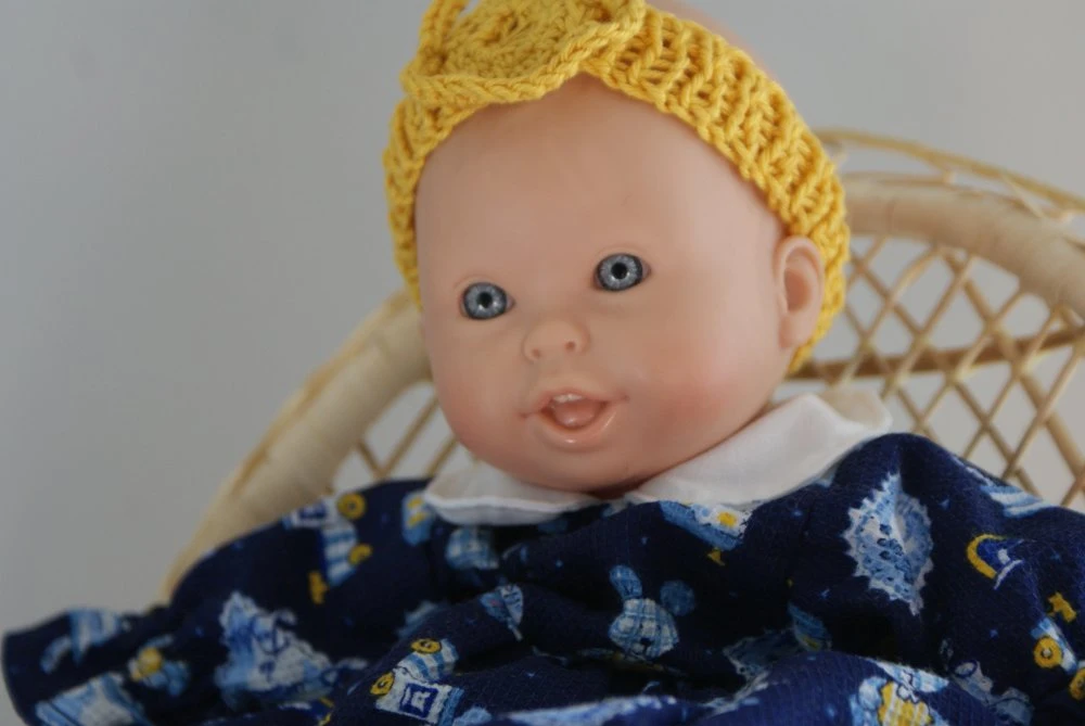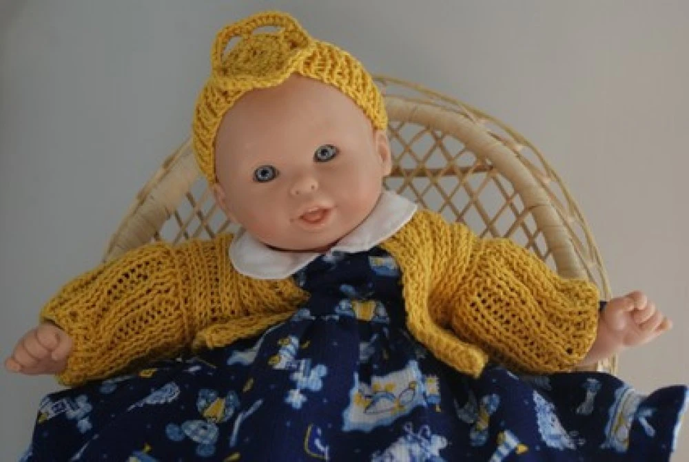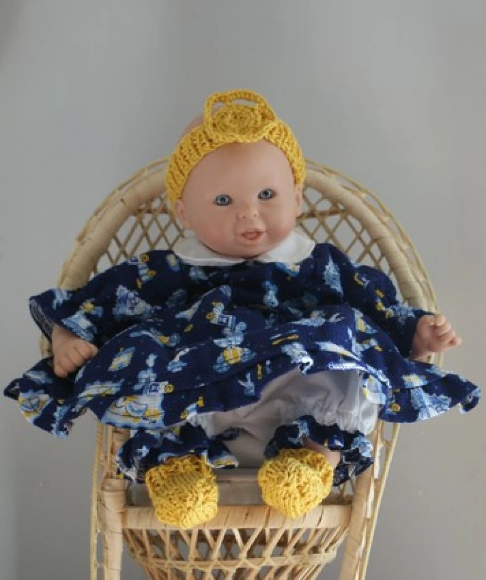tenue pour poupon de 30 cm , composée de 5 pièces : une petite robe fond bleu marine imprimée bleus pales et jaune ,avec volant en bas de robe et fermée par boutons pressions dans le dos , une petite culotte bouffante élastiquée ,un gilet,un bandeau et une paire de petits chaussons en coton jaune coordonné.