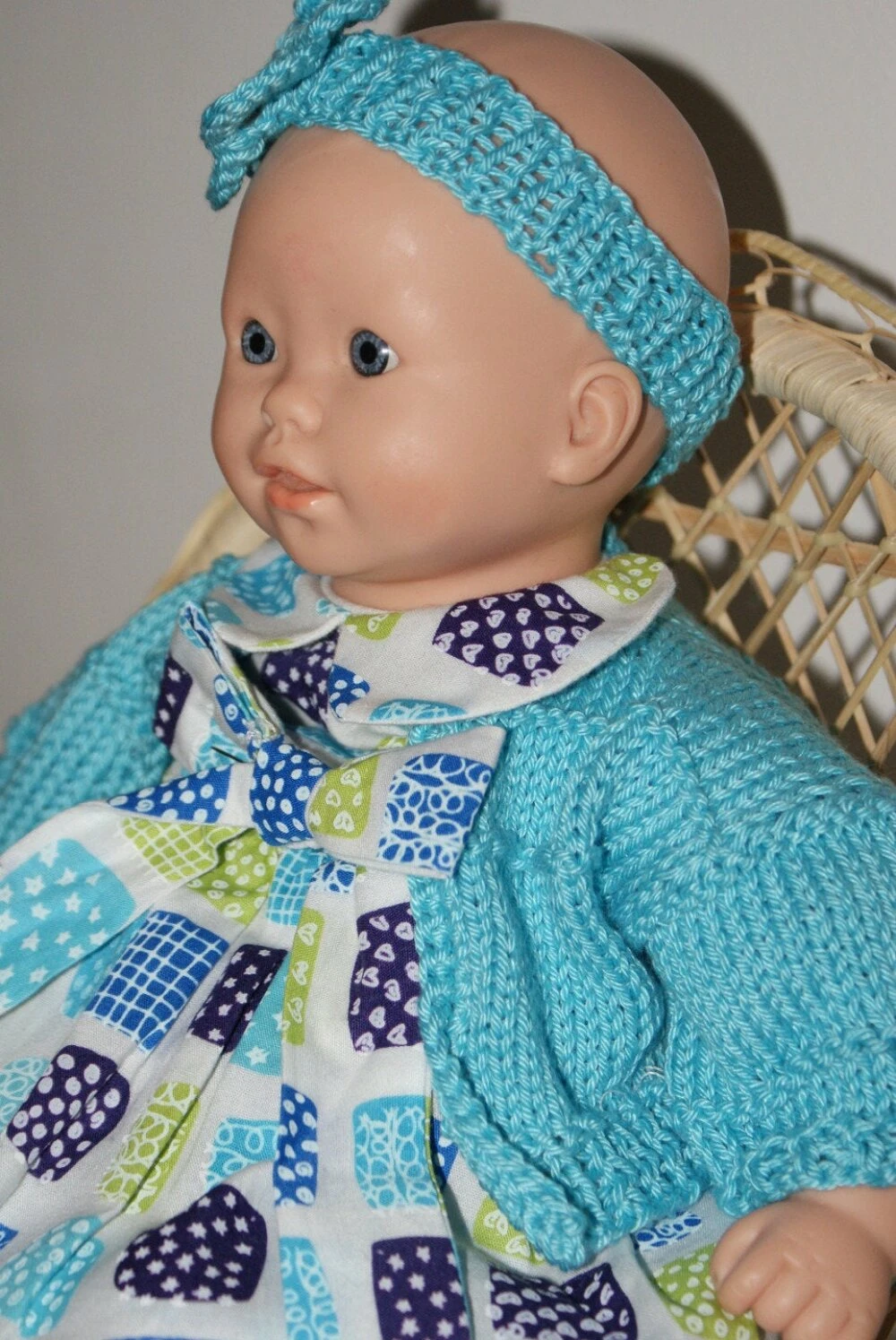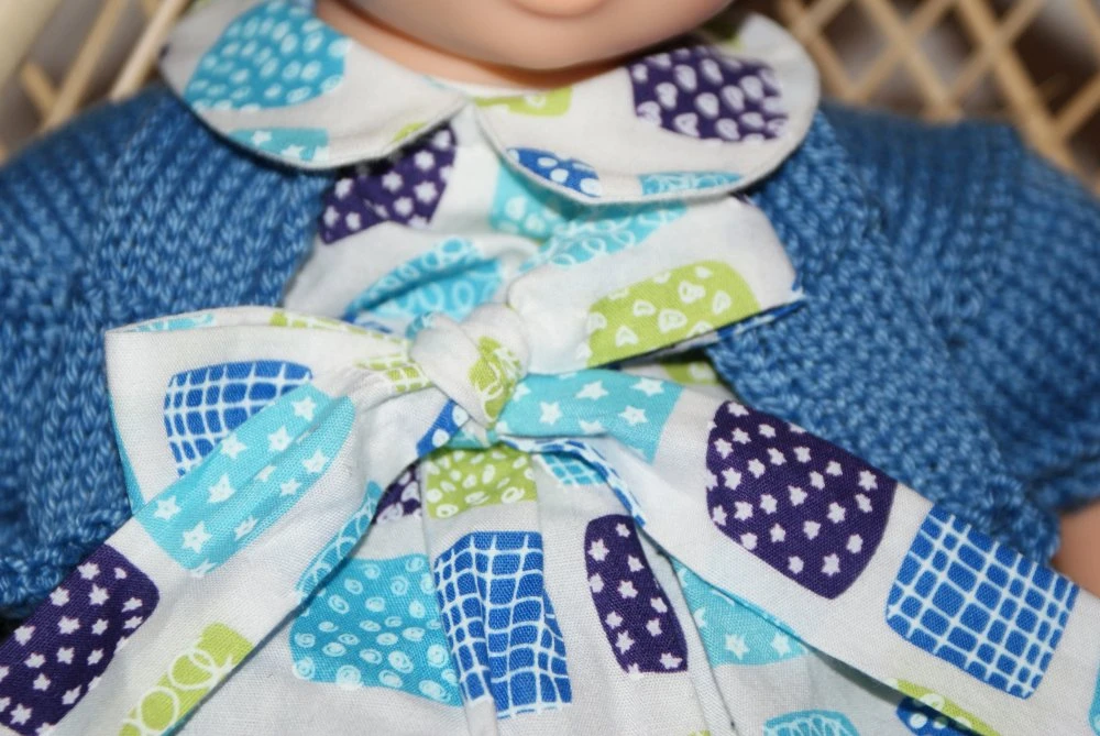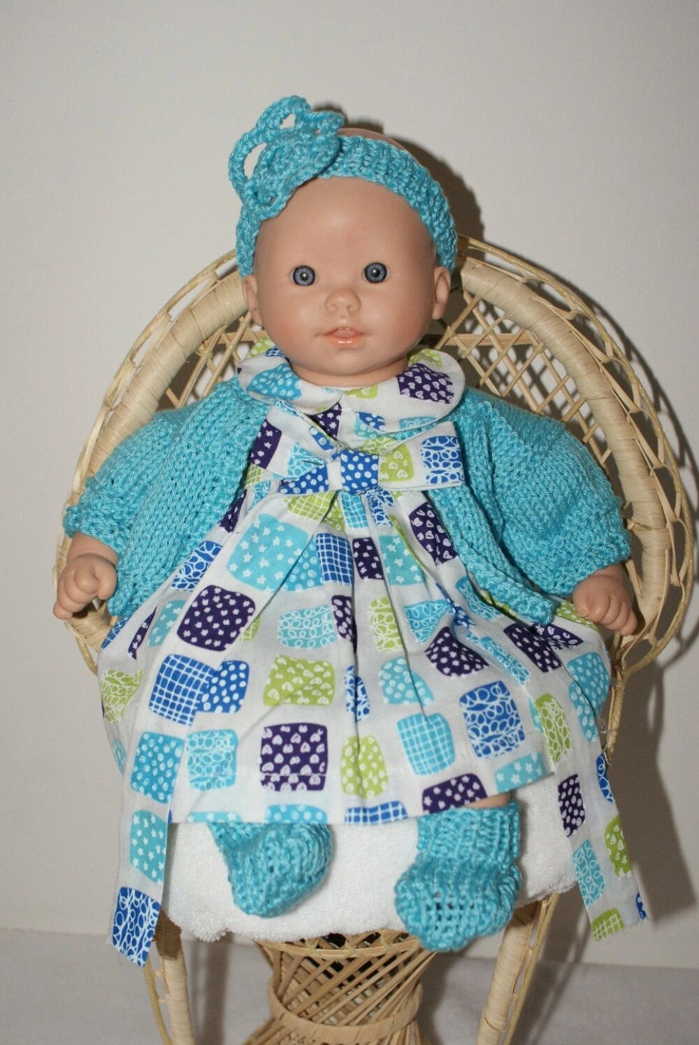 une petite robe fond blanc imprimée de petits carrés tons bleus , verts , turquoises ,fermée par boutons pressions dans le dos , une petite culotte bouffante élastiquée ,un gilet,un bandeau et une paire de petits chaussons en coton bleu turquoise.