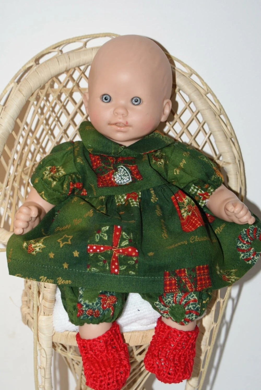 tenue thème Noel pour poupon de 30 cm , composée de 5 pièces : une petite robe verte et rouge imprimée cadeaux de Noel et fermée par boutons pressions dans le dos , une petite culotte bouffante verte élastiquée , un petit gilet , un bandeau et une paire de chaussons rouge.