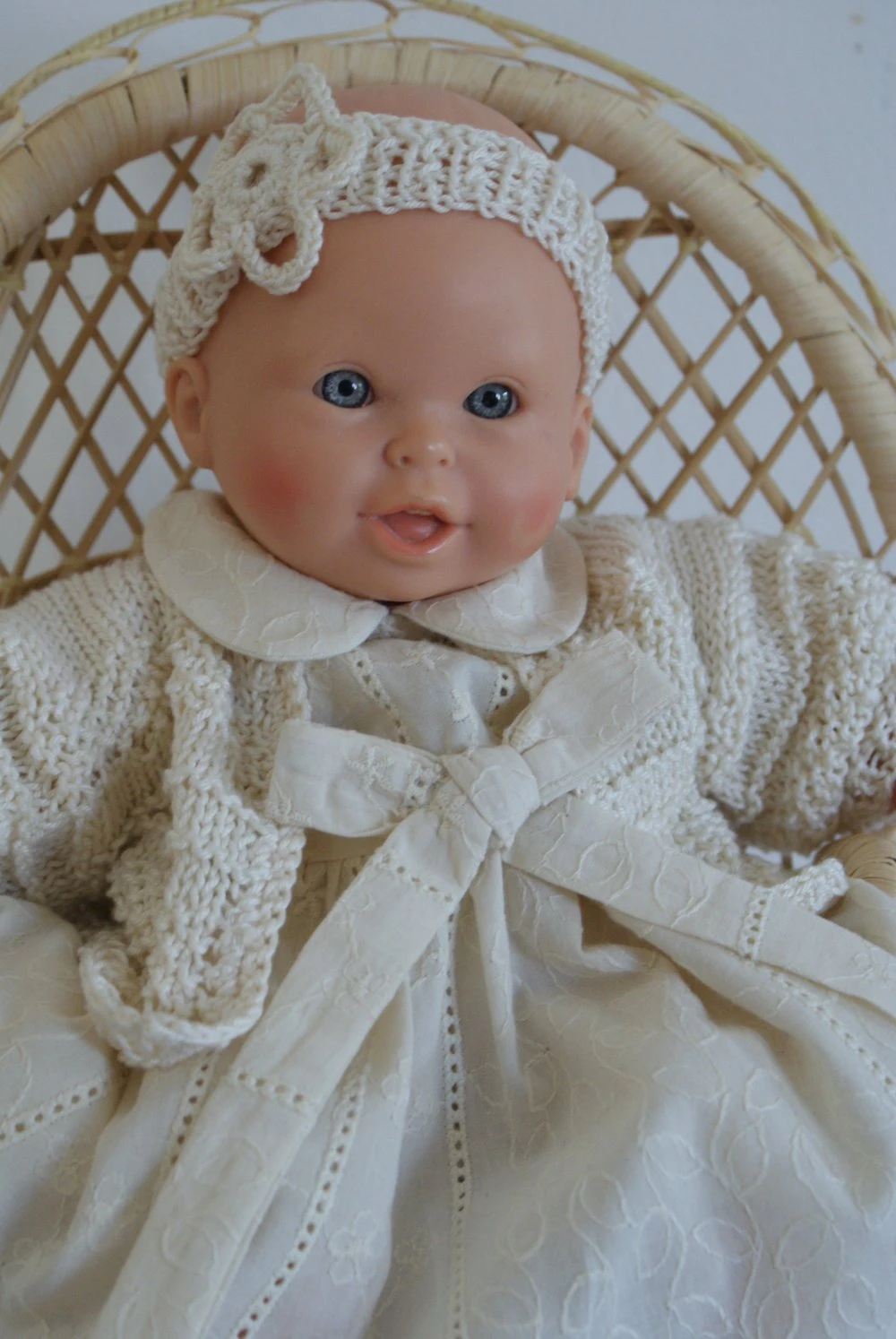 une petite robe en tissu coton blanc cassé avec broderie anglaise ton sur tons ,fermée par boutons pressions dans le dos , une petite culotte bouffante élastiquée ,un gilet,un bandeau et une paire de petits chaussons en coton blanc cassé.