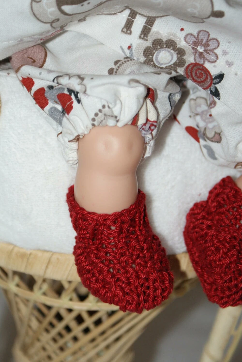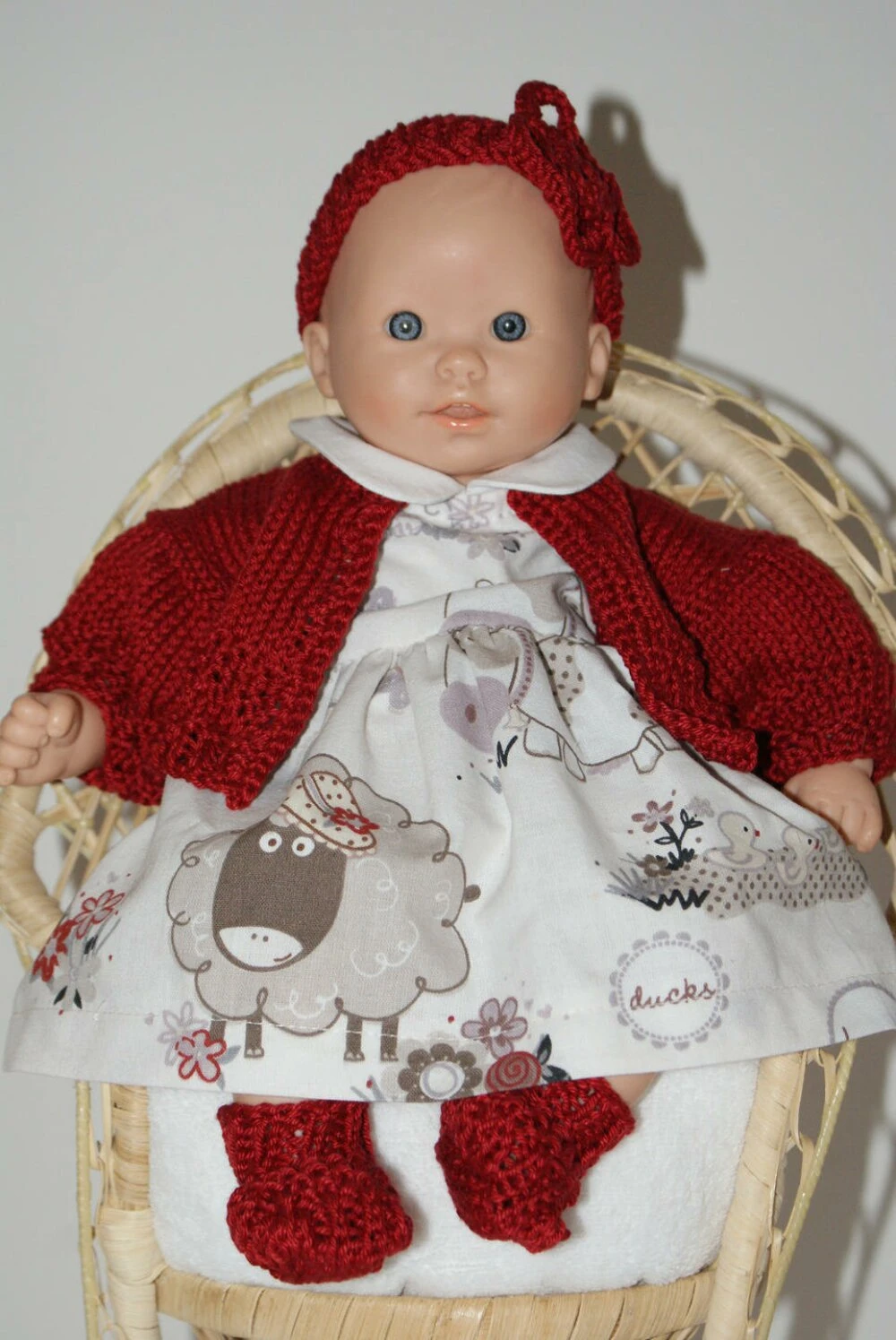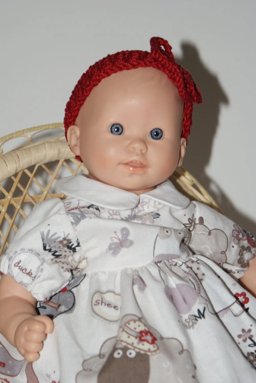 une petite robe tissu beige imprimé animaux de la ferme tons gris ,fermée par boutons pressions dans le dos , une petite culotte bouffante élastiquée ,un gilet,un bandeau et une paire de petits chaussons en coton bordeaux.