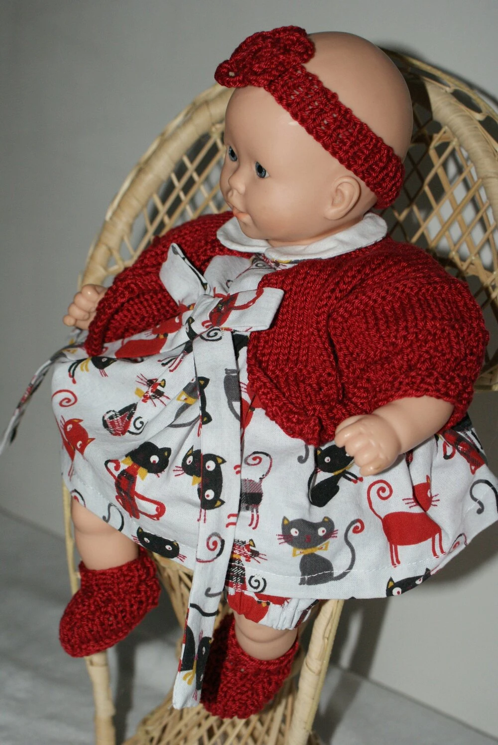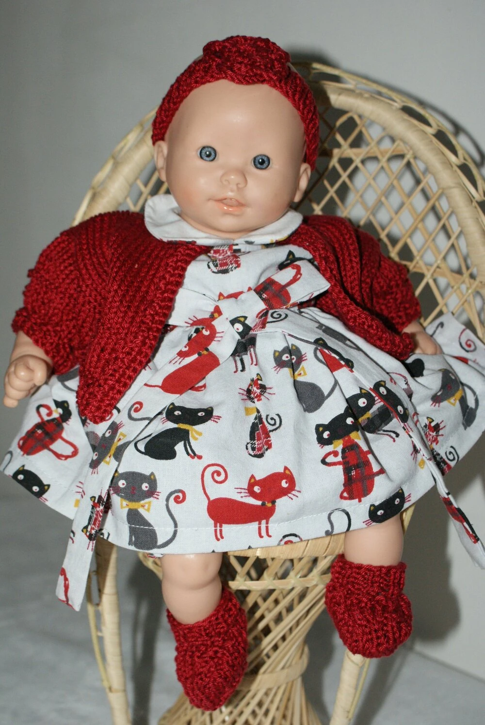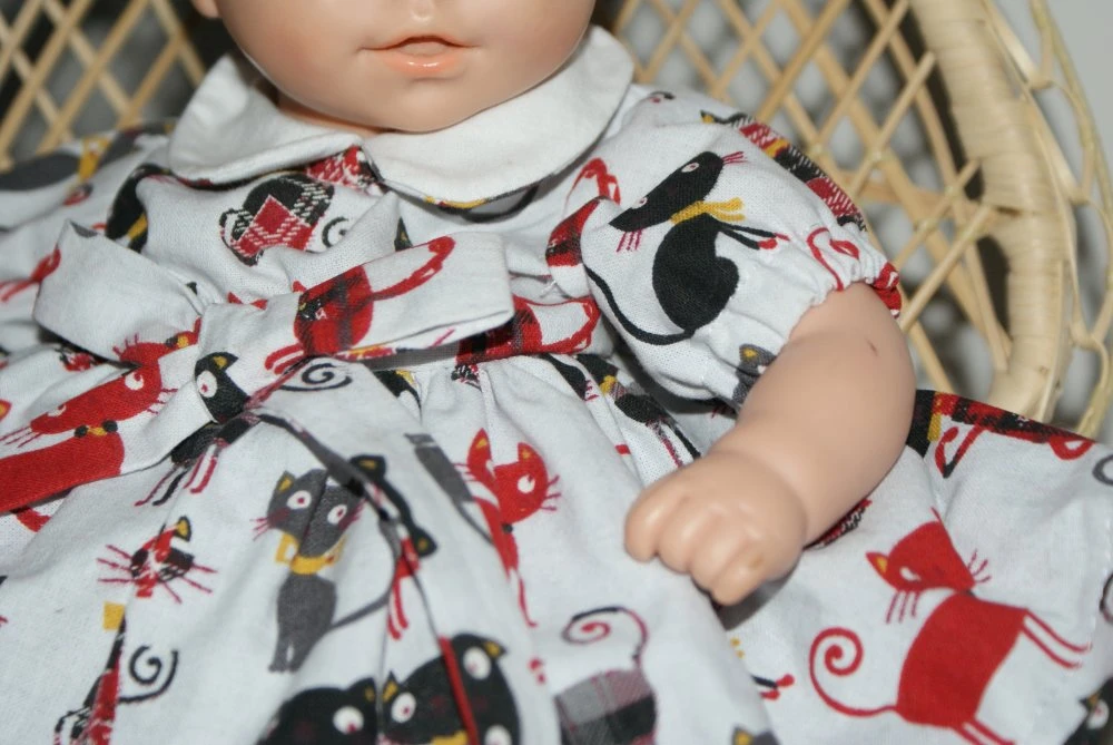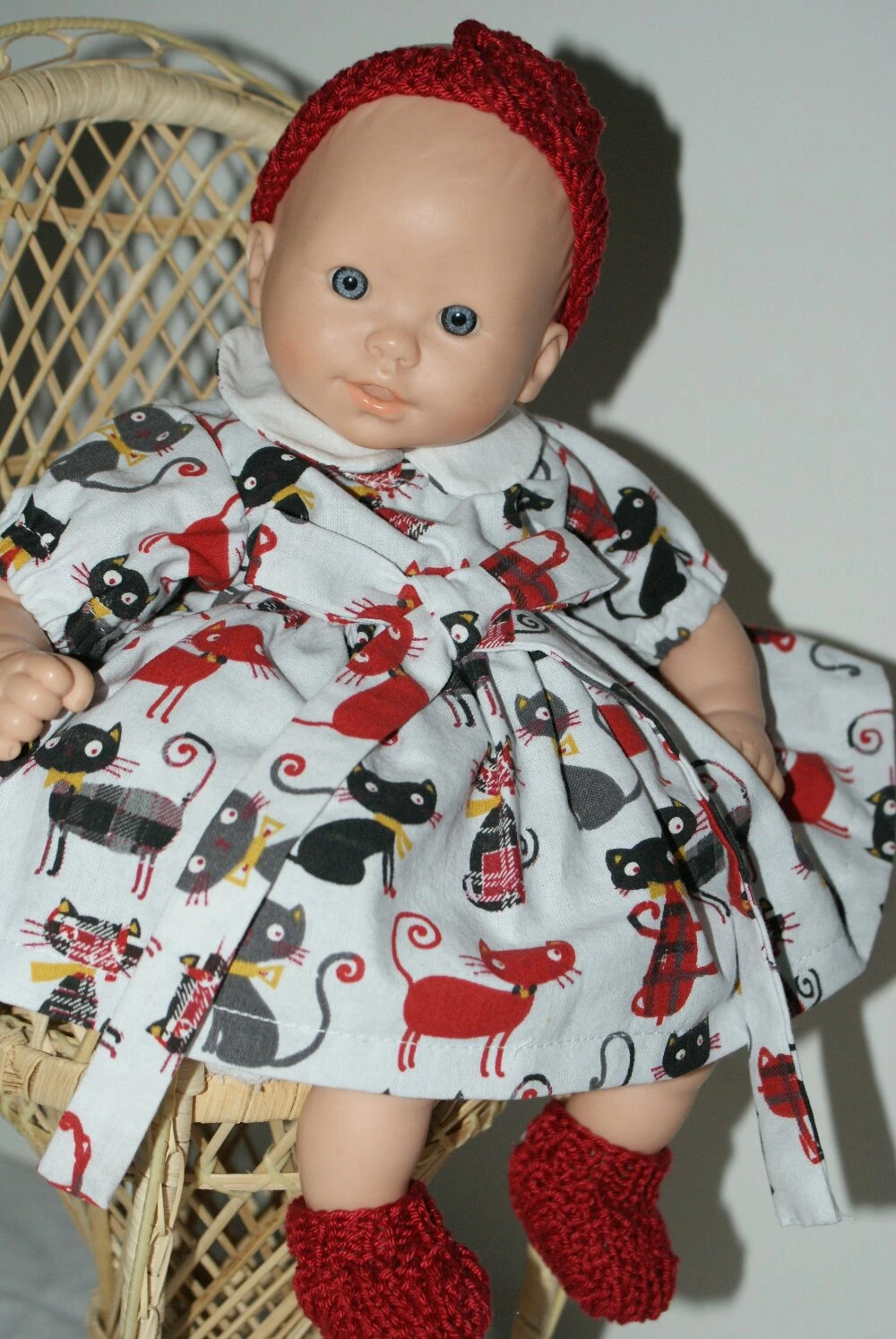 une petite robe en coton fond blanc imprimée de petits chats noirs, bordeaux et gris, avec un noeud sur de devant de la robe . Robe fermée par boutons pressions dans le dos , avec une petite culotte bouffante élastiquée à la taille ,un gilet,un bandeau et une paire de petits chaussons en coton bordeaux.