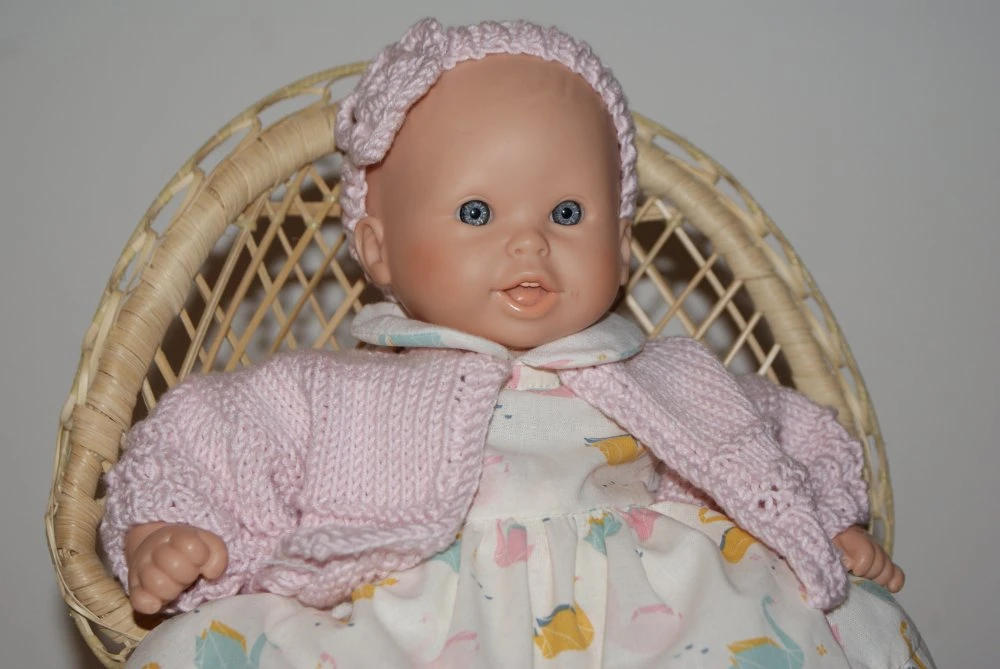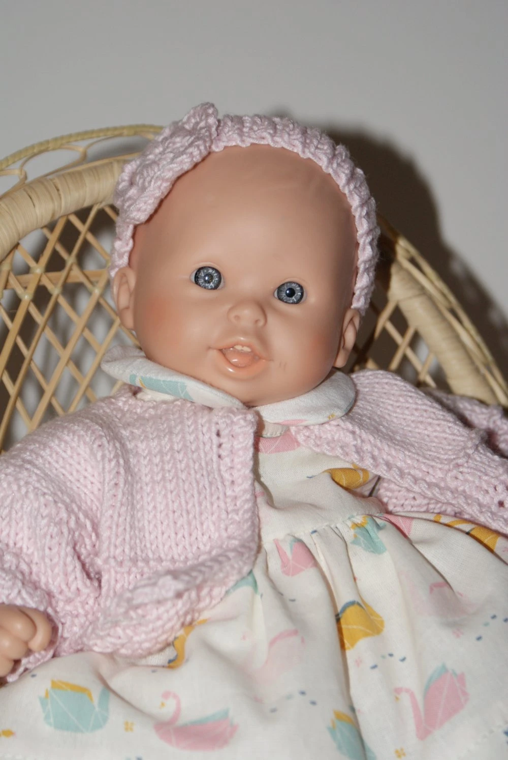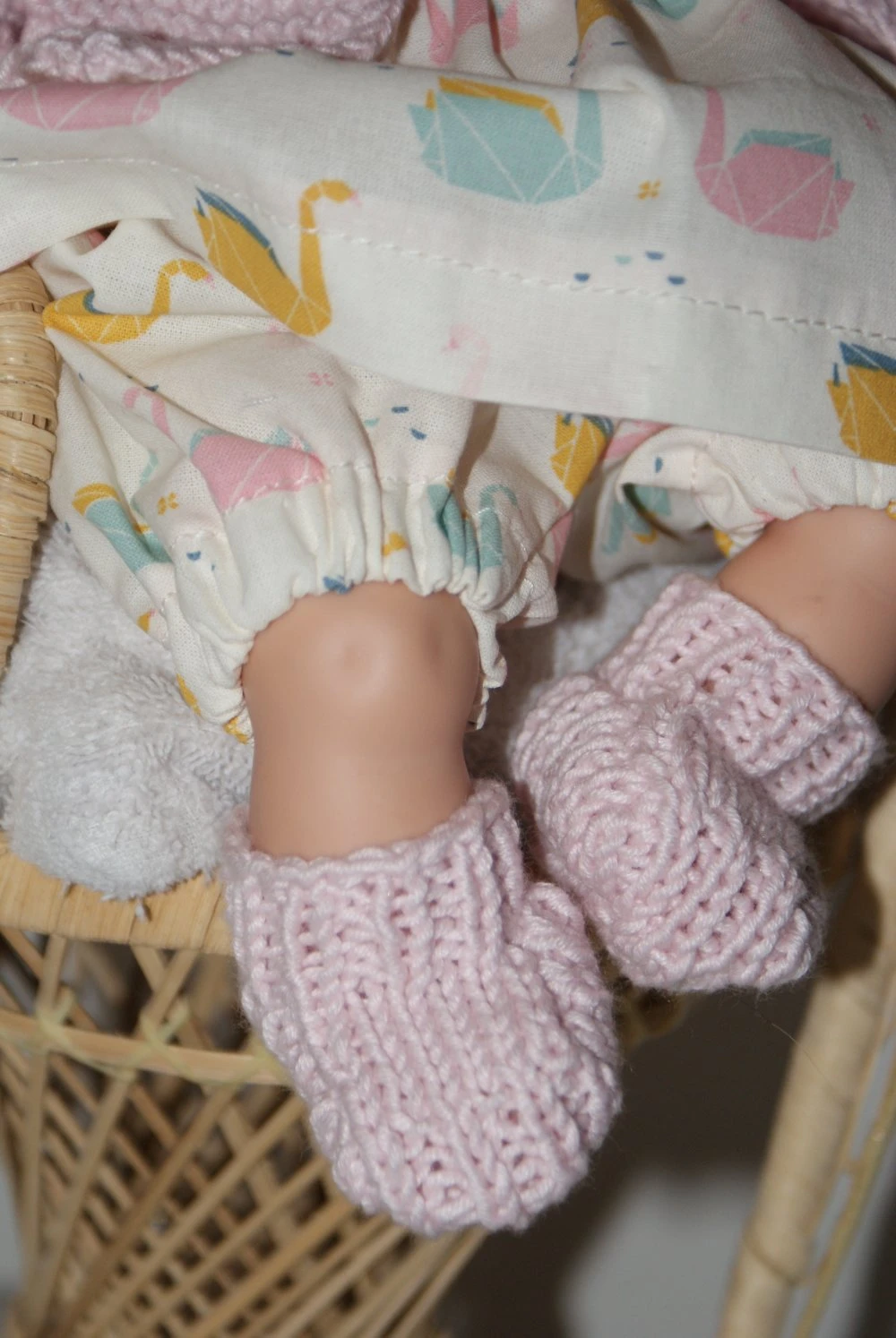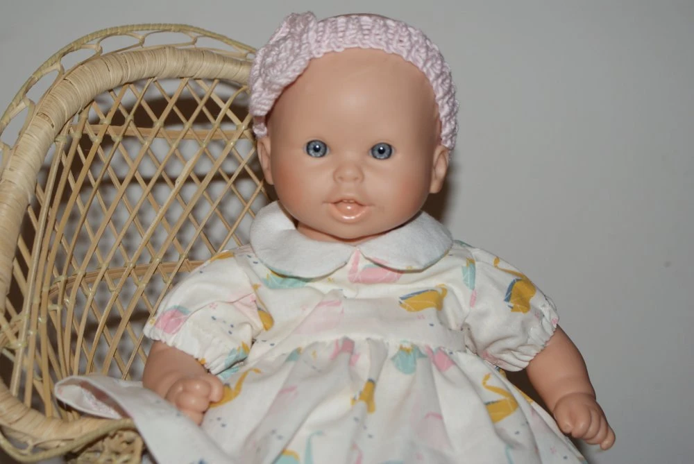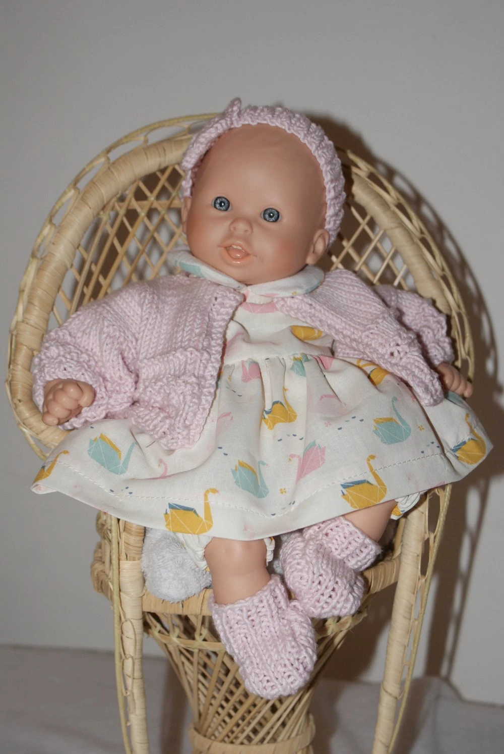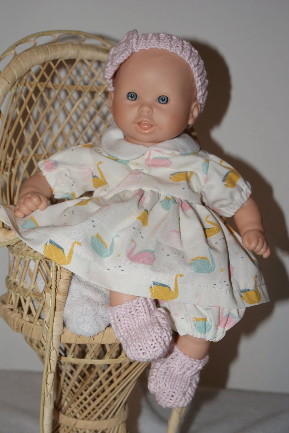 une petite robe en coton fond blanc imprimé de petites cocottes en papiers tons pastels, avec petit col blanc , fermée par boutons pressions dans le dos , une petite culotte bouffante élastiquée coordonnée et un gilet,un bandeau et une paire de petits chaussons en coton rose pale.