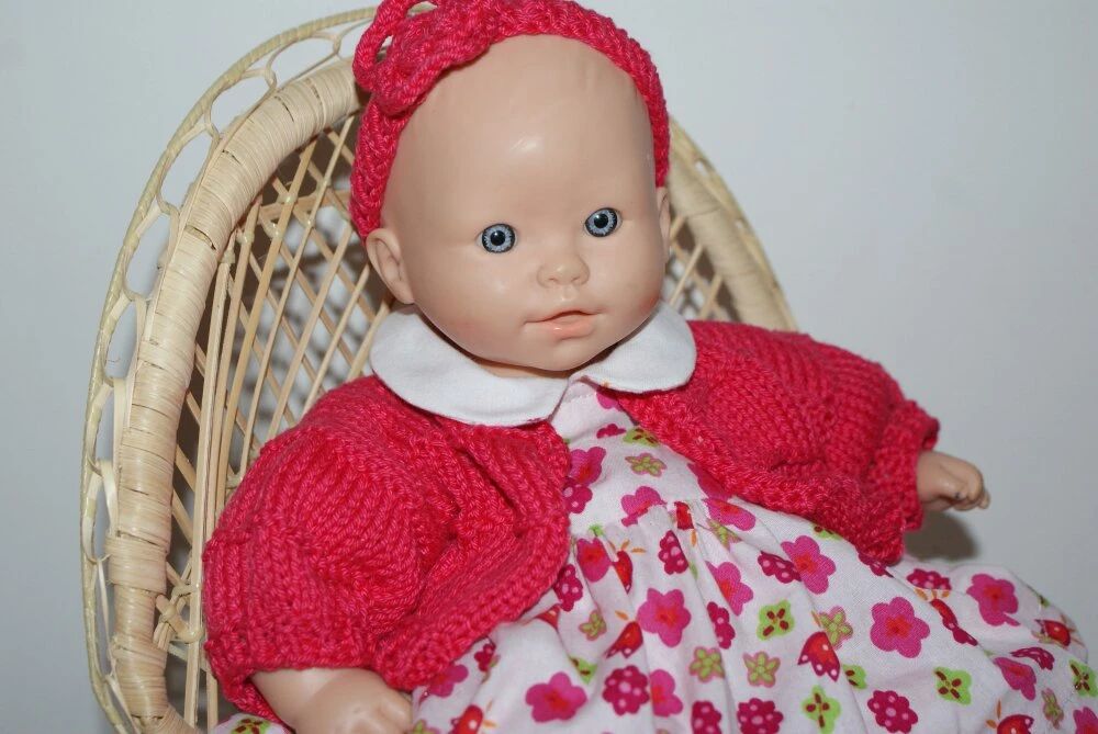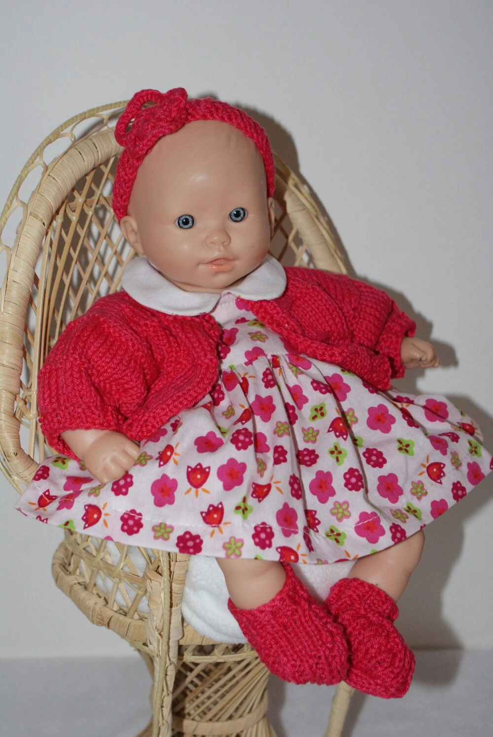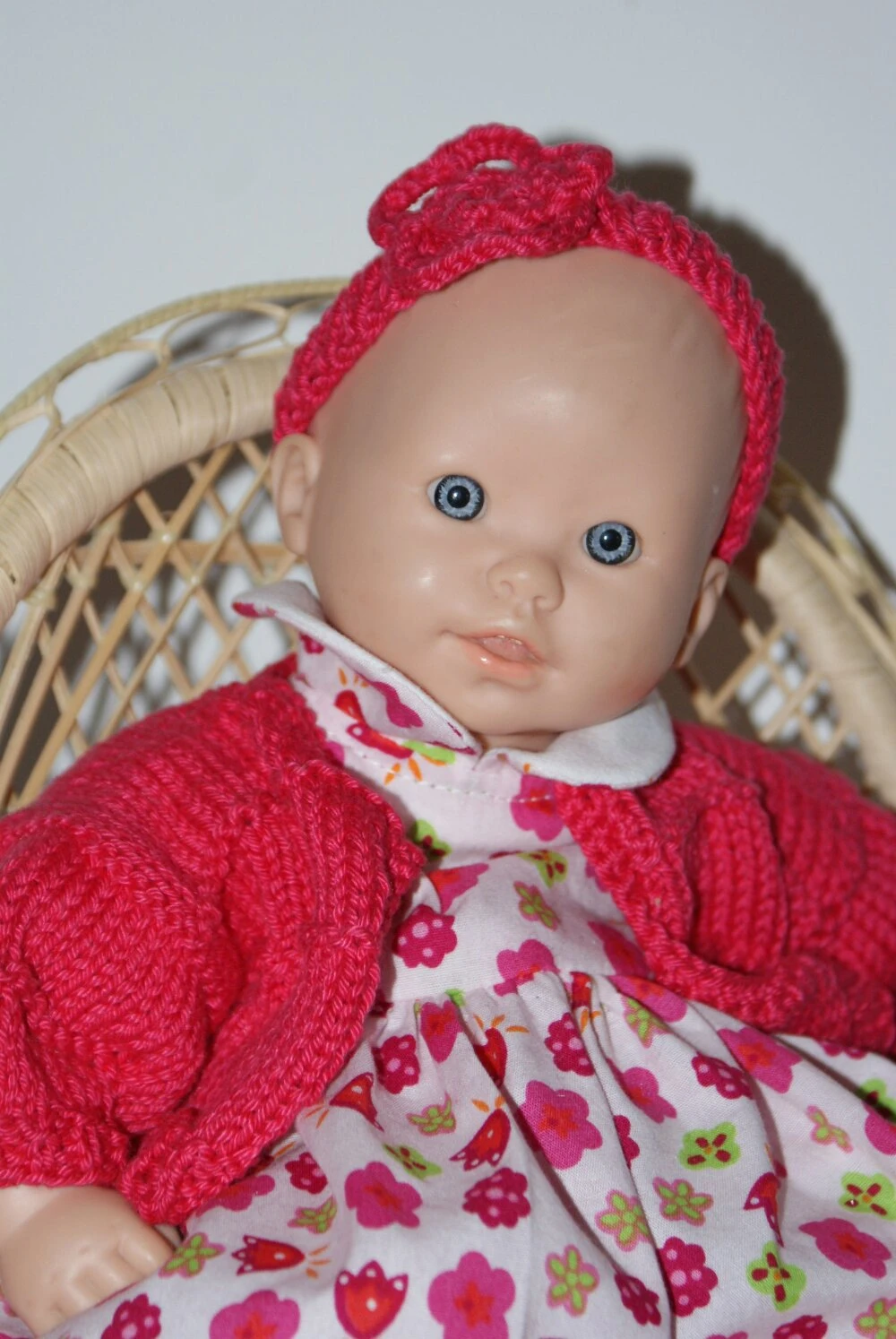 une petite robe en coton tissu fond blanc imprimé de petites fleurs tons roses et fuchsia, avec petit col blanc , fermée par boutons pressions dans le dos , une petite culotte bouffante élastiquée coordonnée et un gilet,un bandeau et une paire de petits chaussons en coton rose fuchsia.