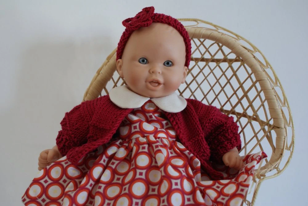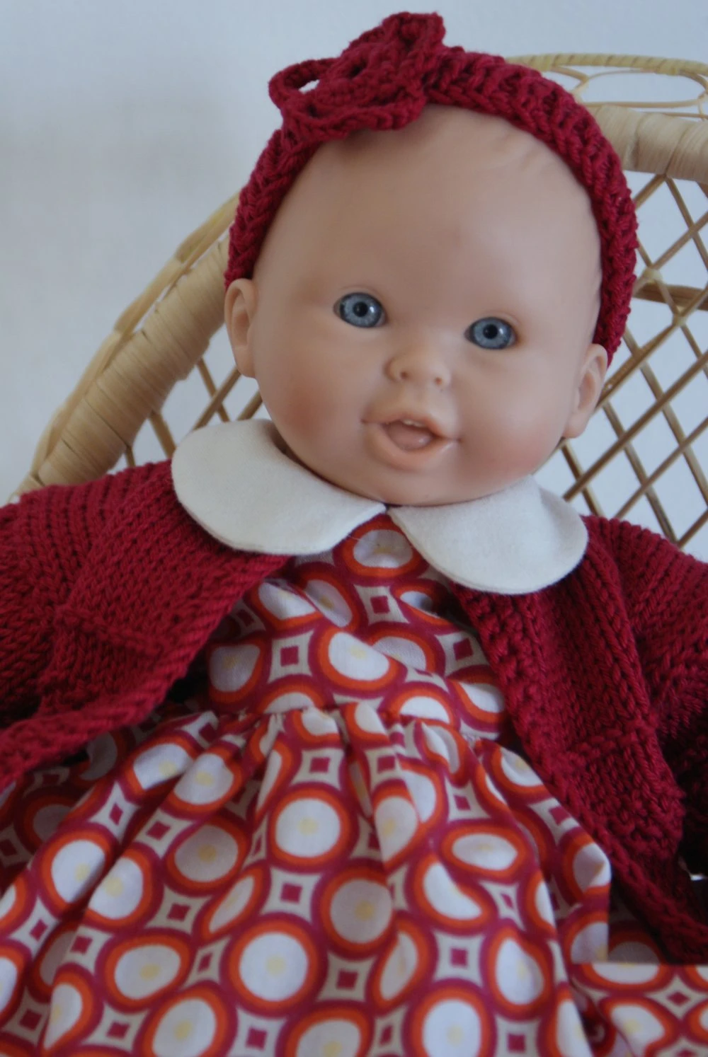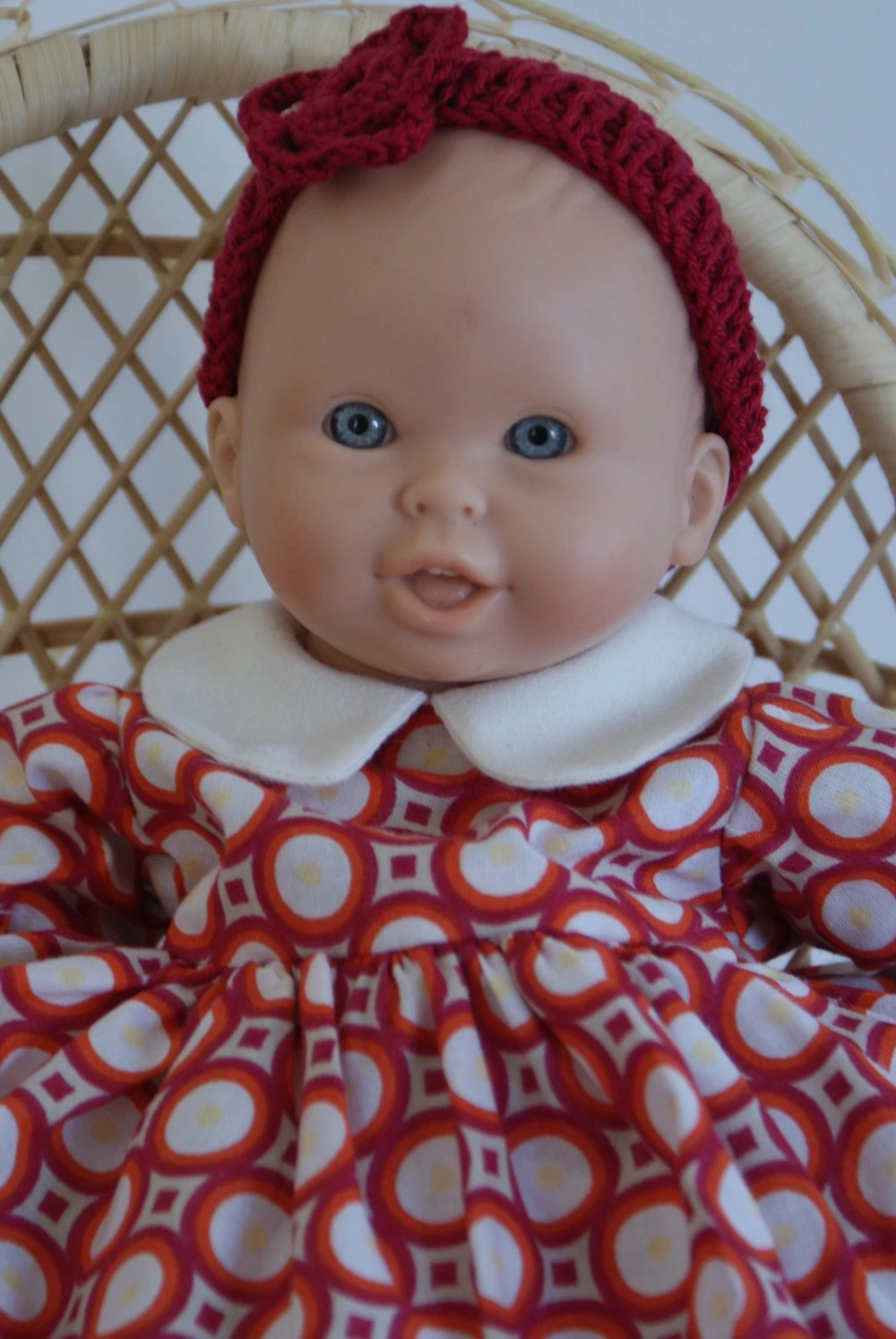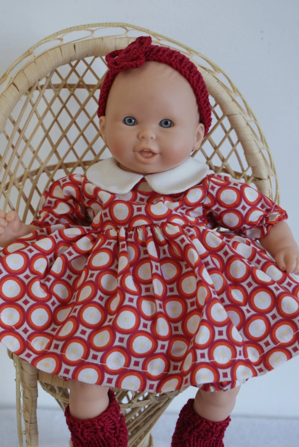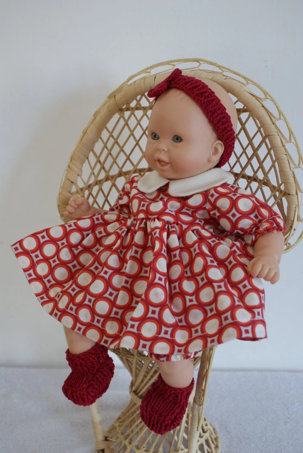 une petite robe en coton imprimé geometiques tons orange , bordeaux et blancs, avec petit col blanc , fermée par boutons pressions dans le dos , une petite culotte bouffante élastiquée coordonnée et un gilet,un bandeau et une paire de petits chaussons en coton bordeaux.