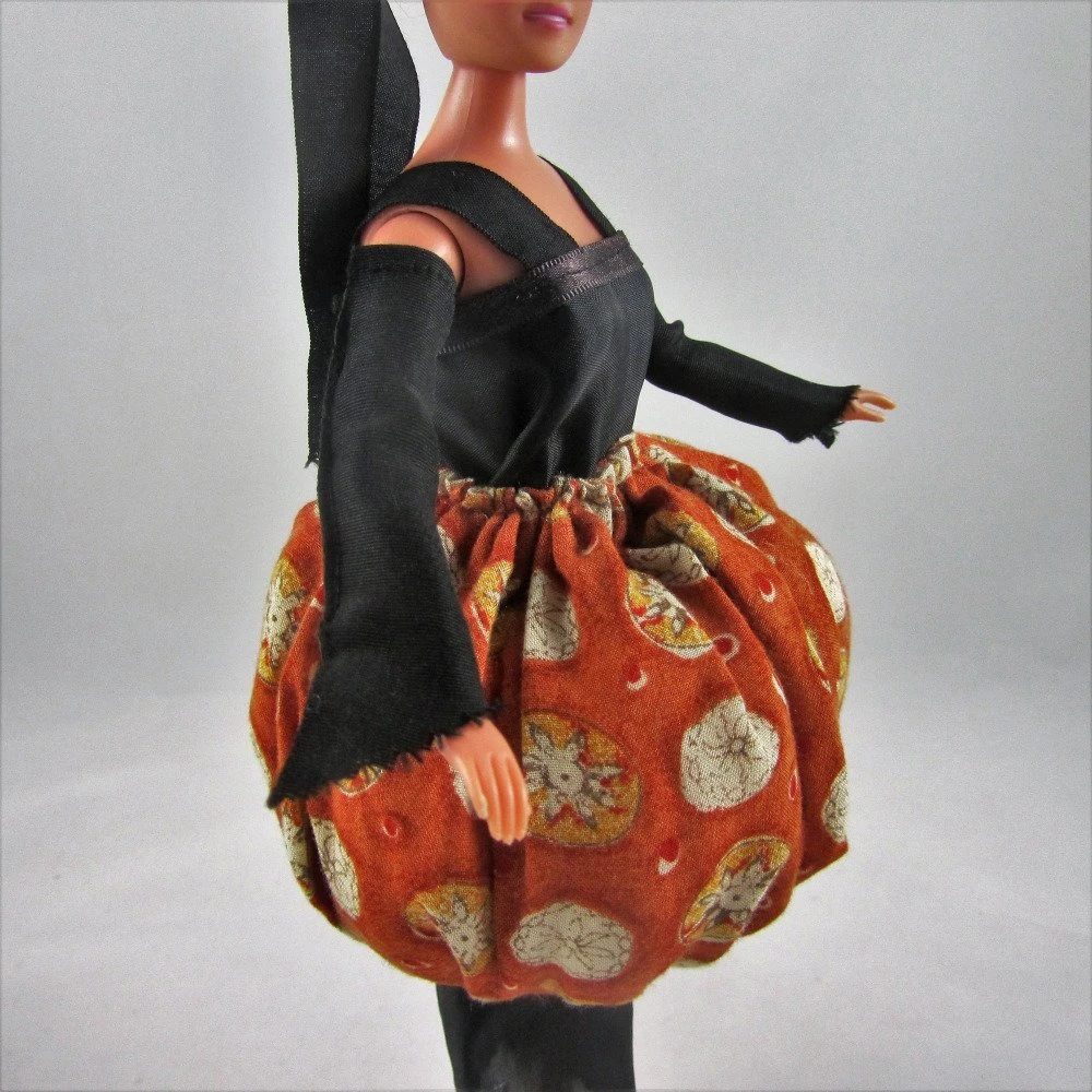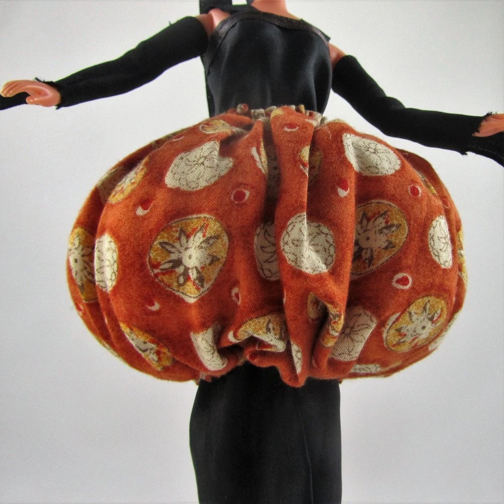 – une longue robe en tissu satiné noir, garnie d’une citrouille tissu imprimé orange, fermée au dos par 2 pressions métal