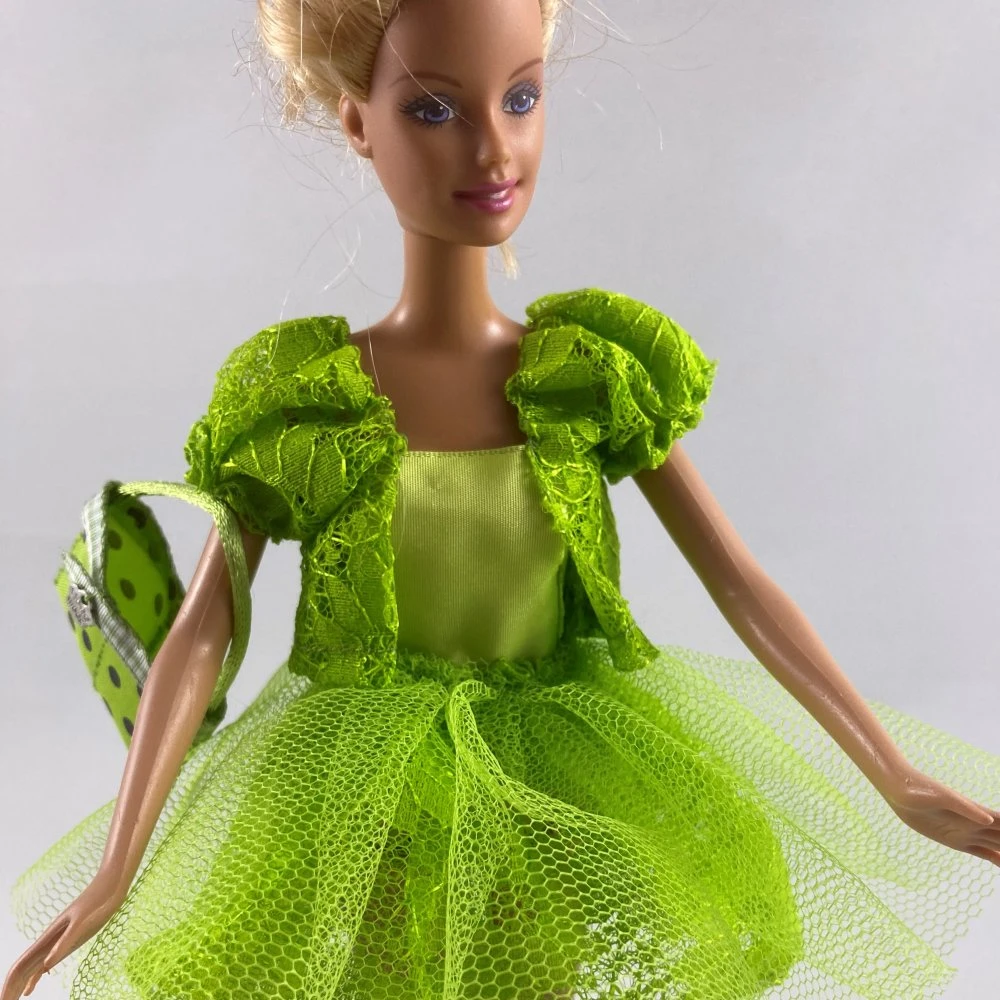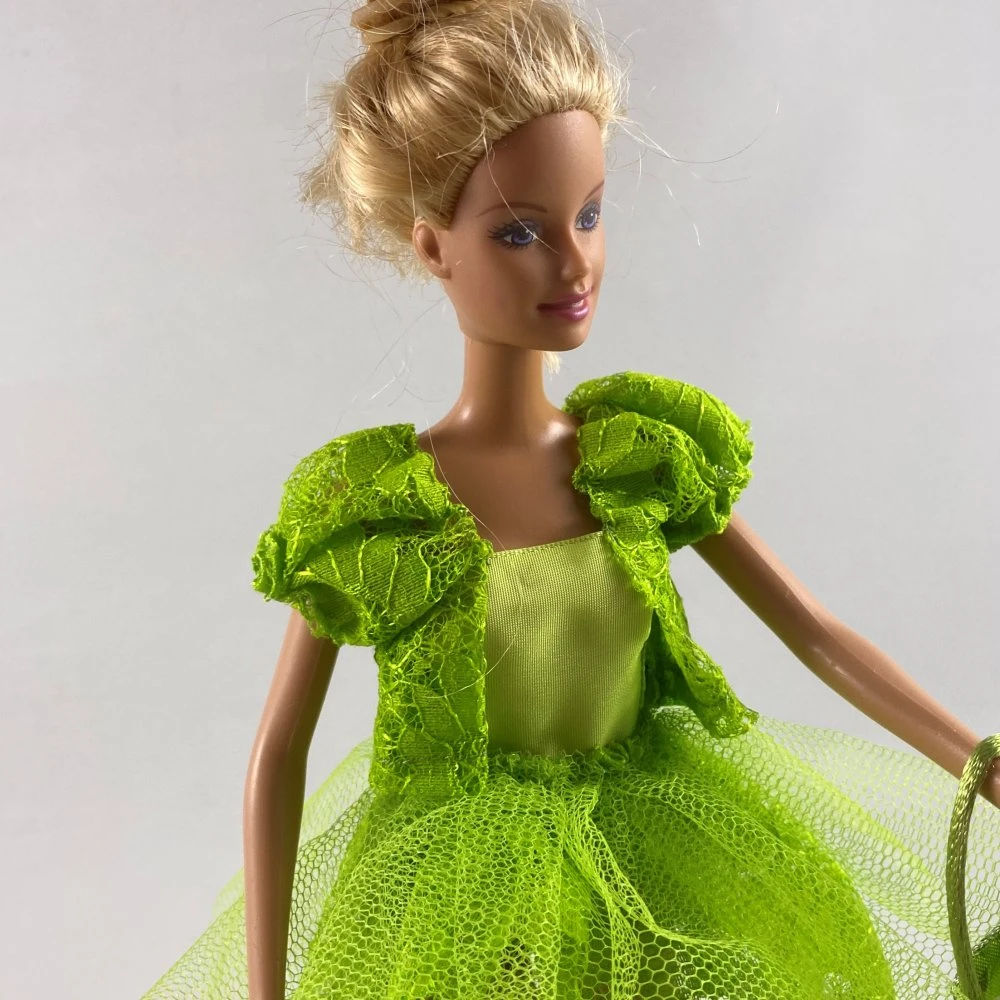 – une robe courte vert printemps, haut en ruban satiné avec un effet boléro (attaché au bustier) en dentelle, manches « ballon », et bas composé de 3 volants (2 en dentelle et volant du dessus en tulle), fermée au dos par 2 pressions métal