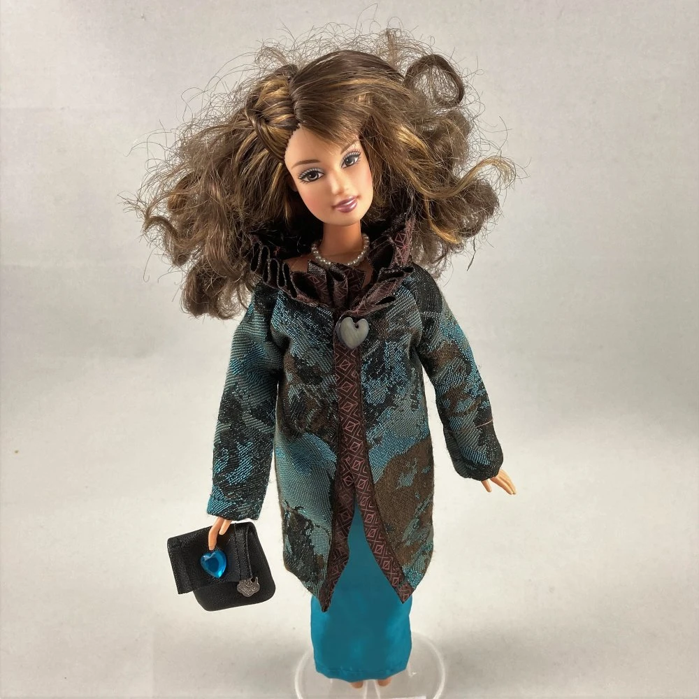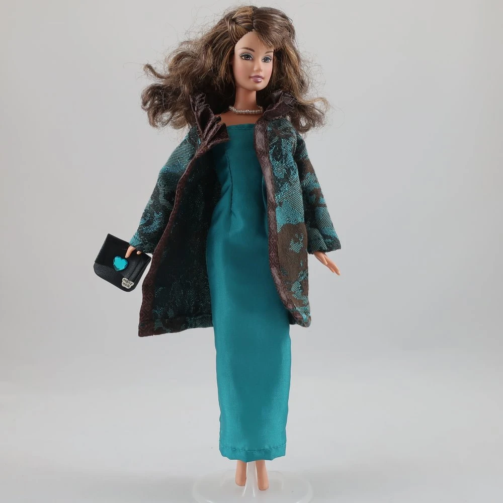 – un manteau fantaisie court en tissu ouvragé turquoise et marron foncé, bordé au col et sur le devant d’un joli galon marron (plissé à l’encolure), fermé par une pression métal et bouton « coeur »
