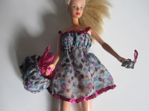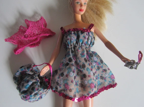 – une robe courte légère, décolletée en coton gris clair à fleurs, bordée à l’encolure et au bas d’un galon sequins, fermée par 2 pressions métal