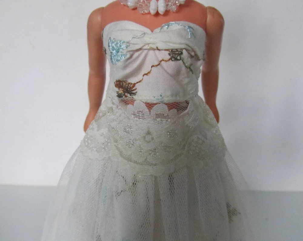 – un bustier en tissu blanc brodé bleu et or bordé au bas par une large dentelle