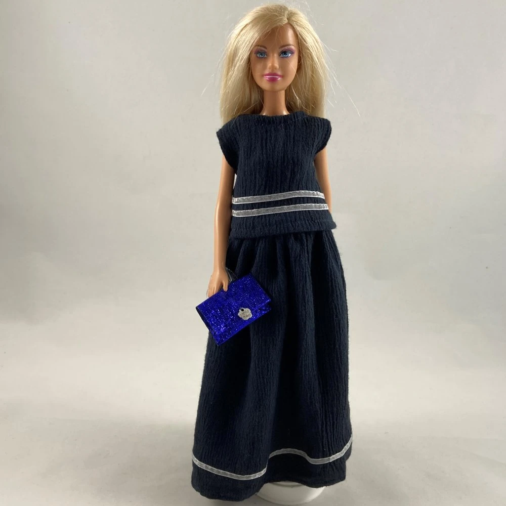– d’une jupe longue froncée et élastiquée à la taille, en tissu crêpe bleu marine, ornée au bas d’un fin ruban d’organza blanc