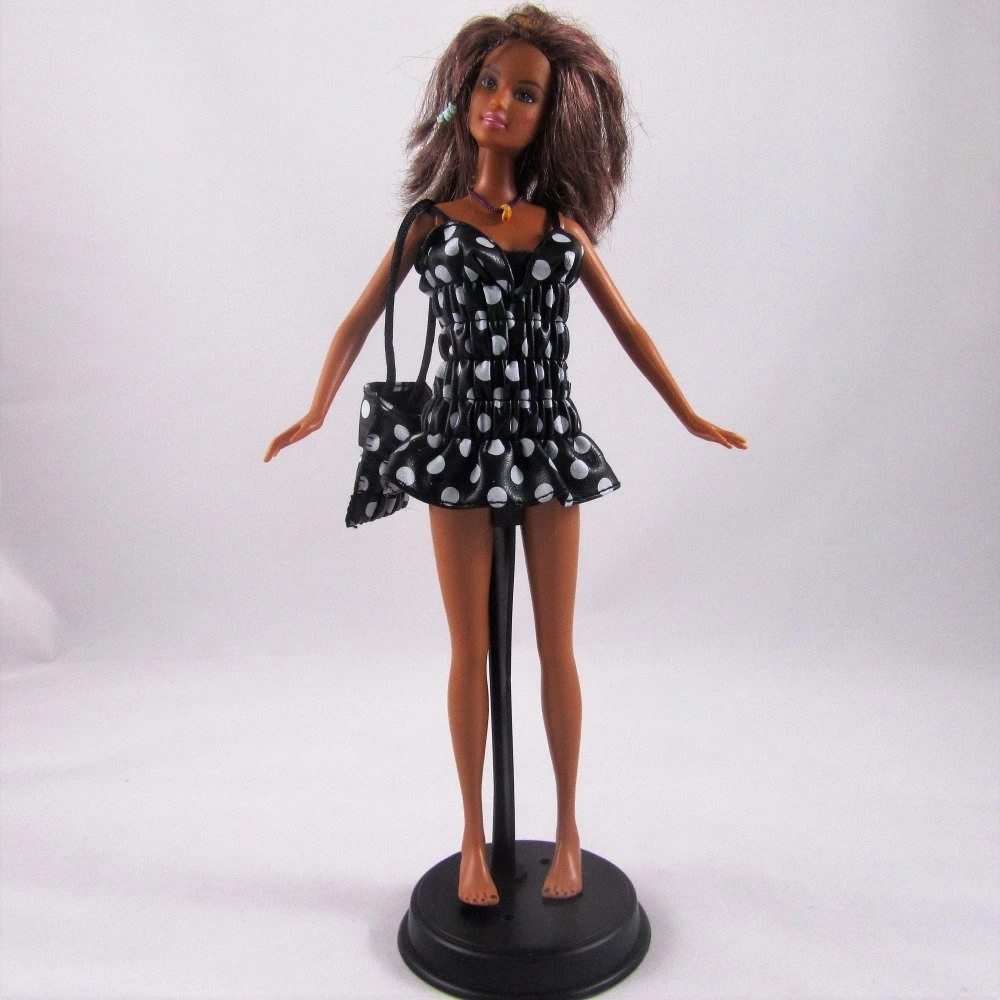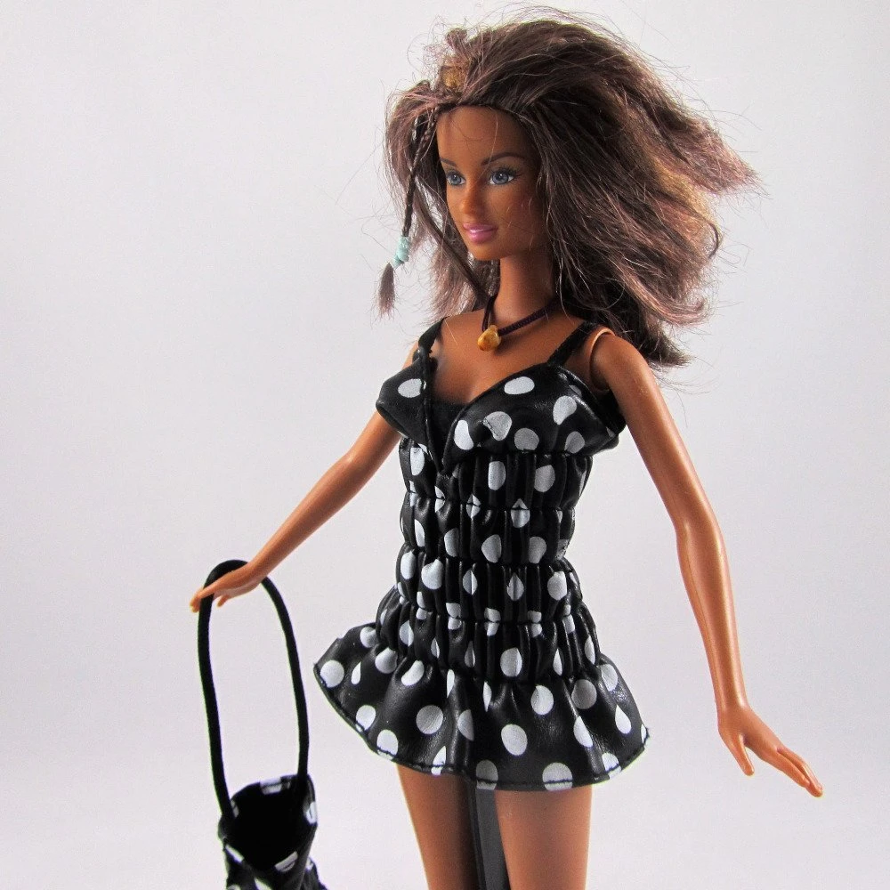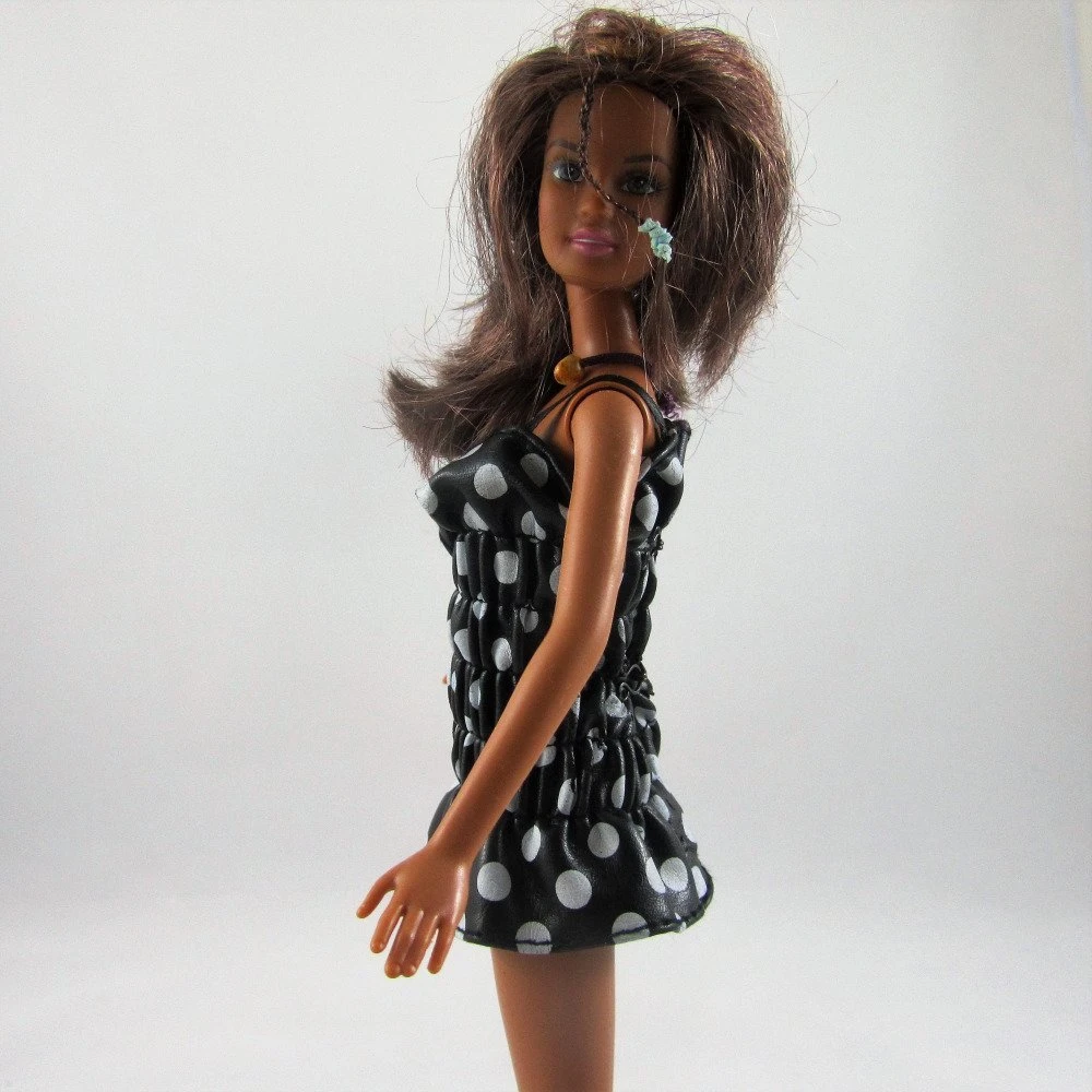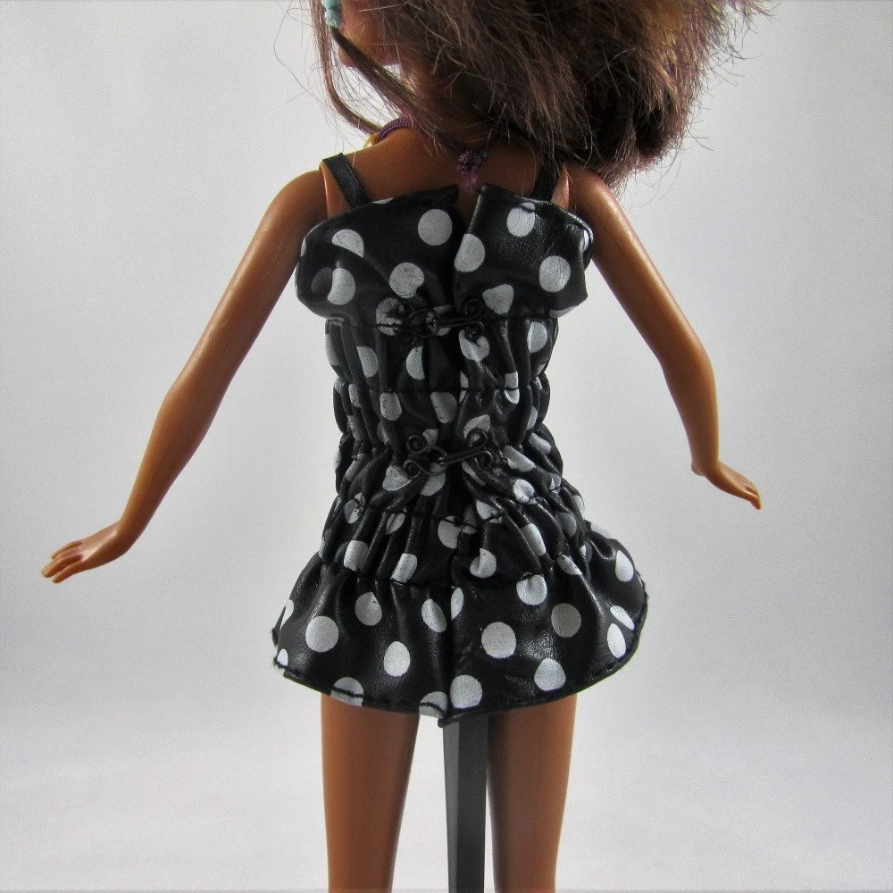 – une tunique ou robe mini en simili cuir noir à pois blancs, décolleté en V, fermée au dos par 2 agrafes métal